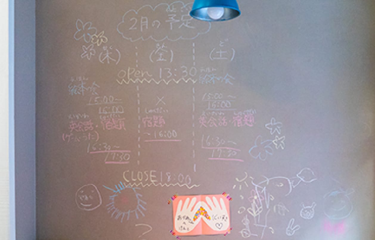 子どもたちが誰でもいつでも気軽に利用できる学び舎、居場所になることを目指し、曜日ごとの基本的な活動メニューを決めて黒板に書くなどの工夫も。また、食べ物への興味や食べることの楽しさを実感できるような料理レッスンも企画。給食のない夏休み中のランチ提供なども検討していきます。