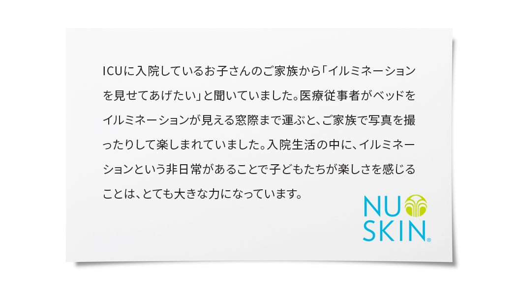 国立成育医療研究センターでは新型コロナウイルス感染症の影響により、現在も面会や病棟内でのイベントなどが制限されています。そこで子どもたちの精神的な不安を軽減できるよう、院内にいながら楽しめる「冬季イルミネーション」が2022年12月から2023年1月まで点灯します。少しでも子どもたちの心を明るくしたいという想いから、「アイノカタチ基金」で実施されるこの取り組みに対しニュースキンはmudefと共に支援を行っており、300万円を寄付しました。