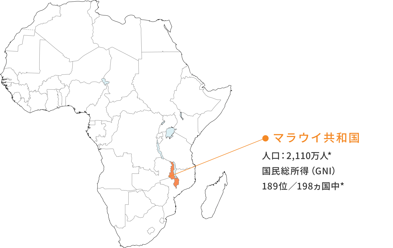 アフリカ南部に位置する内陸国。マラウイでは、5歳以下の子どもたちの2人に1人が栄養不全に陥っていると言われています。さらに、自然災害の頻発や、HIV感染率の高さなど、子どもたちは生まれたときから多くの困難を背負っています。